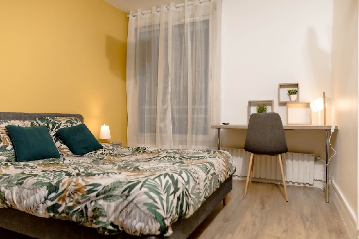 Retrouvez la chambre meublée d'un grand lit double, d'un bureau, d'une penderie, d'une Smart TV et une literie complète (housse de couette, taies d'oreiller et serviettes).